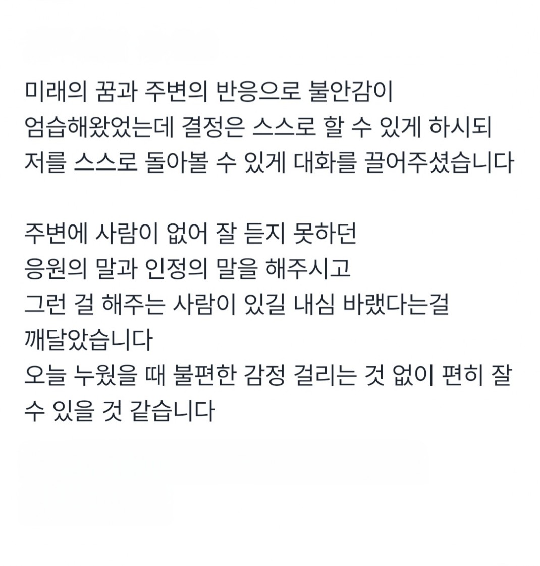 미래의 꿈과 주변의 반응으로 불안감이 엄습해왔었는데 작성자관리자 등록일 25-08-25 조회29회 본문 미래의 꿈과 주변의 반응으로 불안감이 엄습해왔었는데 결정은 스스로 할수 있게 하시되 저를 스스로 돌아볼 수 있게 대화를 끌어주셨습니다 세심한 상담감 사합니다..^^ 친절하시고 상냥하게 응대해주십니다. 목록 글쓰기