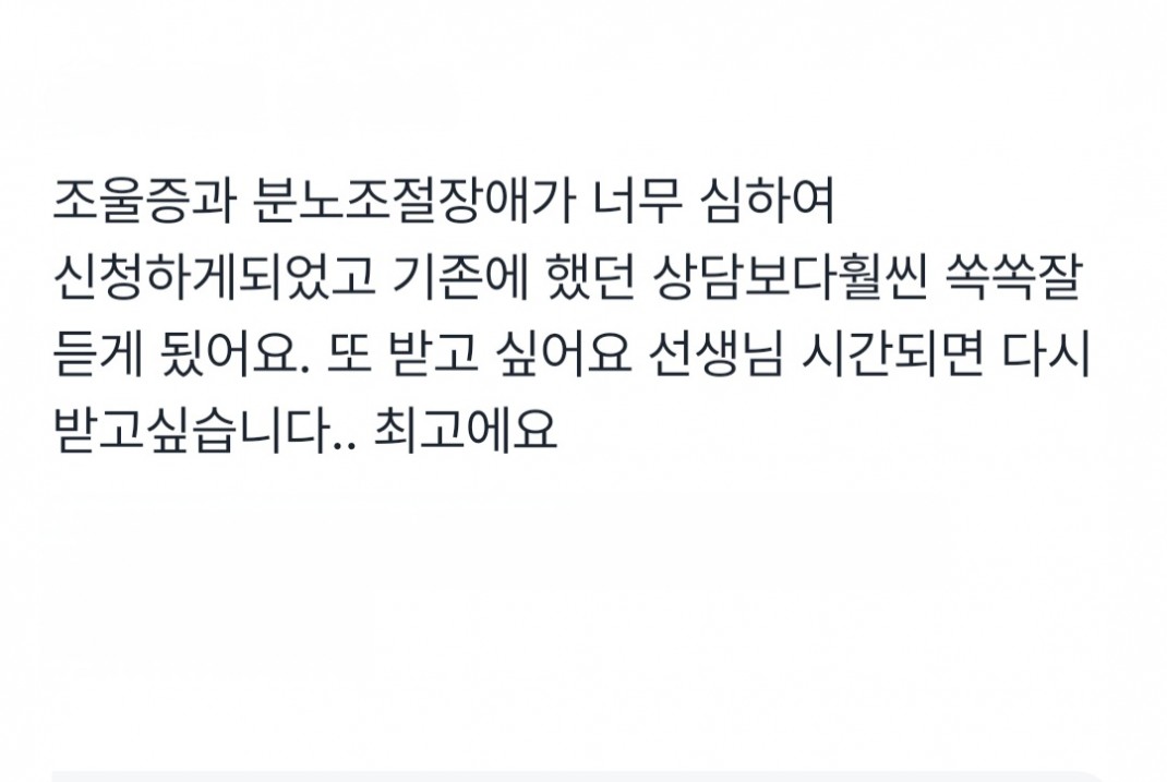 조울증과 분노조절장애가 너무 심하여 신청하게되었고 작성자관리자 등록일 25-08-25 조회28회 본문 조울증과 분노조절장애가 너무 심하여 신청하게되었고 기존에 했던 상담보다훨씬 쏙쏙잘 듣게 됬어요. 또 받고 싶어요 선생님 시간되면 다시 받고싶습니다.. 최고에요 와이프 문제로 너무 답답하고 힘들었는데, 저는 다음상담때 제가 해야 하는 숙제가 생겨서 좋았습니다. 목록 글쓰기