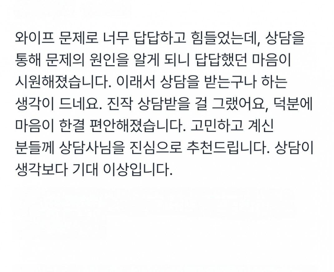와이프 문제로 너무 답답하고 힘들었는데, 작성자관리자 등록일 25-08-25 조회36회 본문 와이프 문제로 너무 답답하고 힘들었는데, 상담을 통해 문제의 원인을 알게 되니 답답했던 마음이 시원해졌습니다. 이래서 상담을 받는구나 하는 생각이 드네요. 따뜻한 말씀들 감사했습니다! 조울증과 분노조절장애가 너무 심하여 신청하게되었고 목록 글쓰기