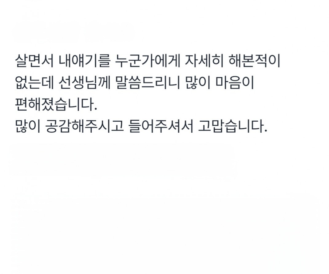 살면서 내얘기를 누군가에게 자세히 해본적이 없는데 작성자관리자 등록일 25-08-25 조회36회 본문 살면서 내얘기를 누군가에게 자세히 해본적이 없는데 선생님께 말씀드리니 많이 마음이 편해졌습니다. 마음이 안정되고 잘들어 주시고 차분하게 상담해주셔서 따뜻한 말씀들 감사했습니다! 목록 글쓰기
