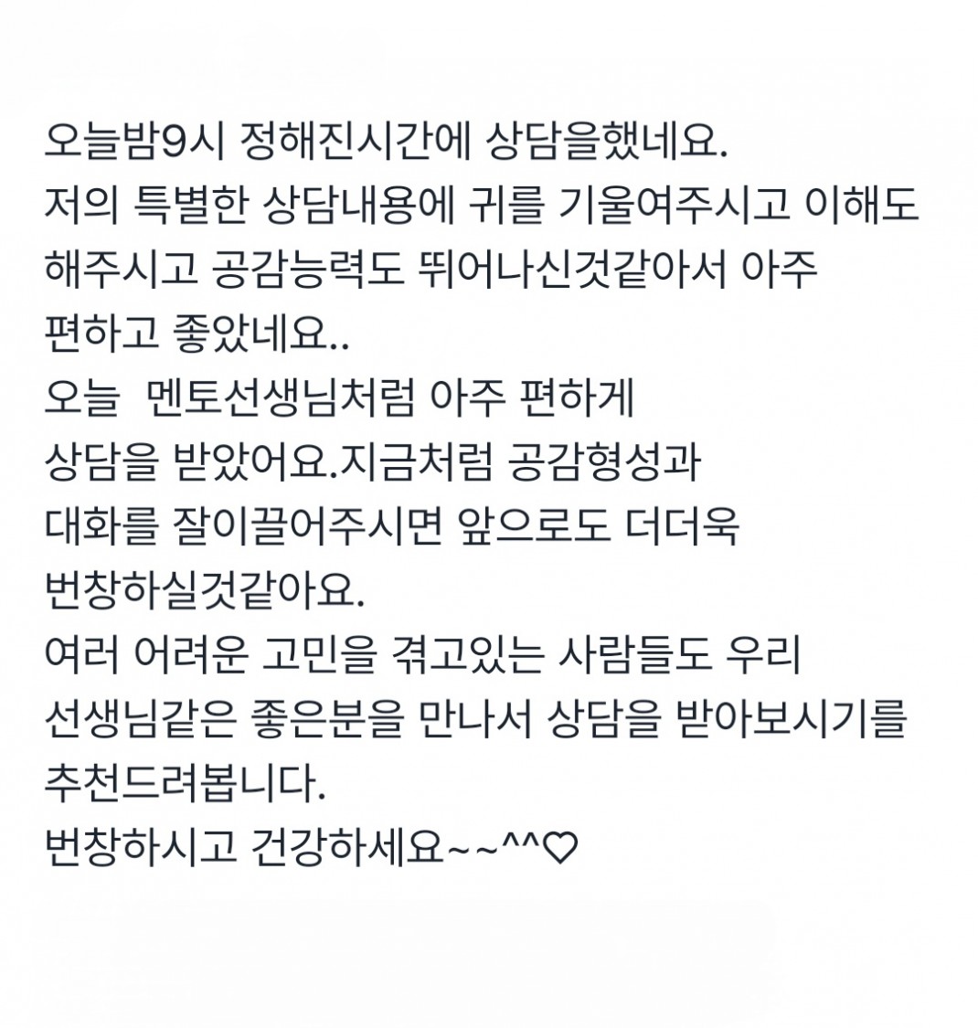 오늘밤9시 정해진시간에 상담을했네요. 작성자관리자 등록일 25-08-25 조회36회 본문 오늘밤9시 정해진시간에 상담을했네요. 저의 특별한 상담내용에 귀를 기울여주시고 이해도 해주시고 공감능력도 뛰어나신것같아서 아주 편하고 좋았네요.. 차분하게 얘기 잘 들어주시고 공감도 잘해주시고 마음이 안정되고 잘들어 주시고 차분하게 상담해주셔서 목록 글쓰기