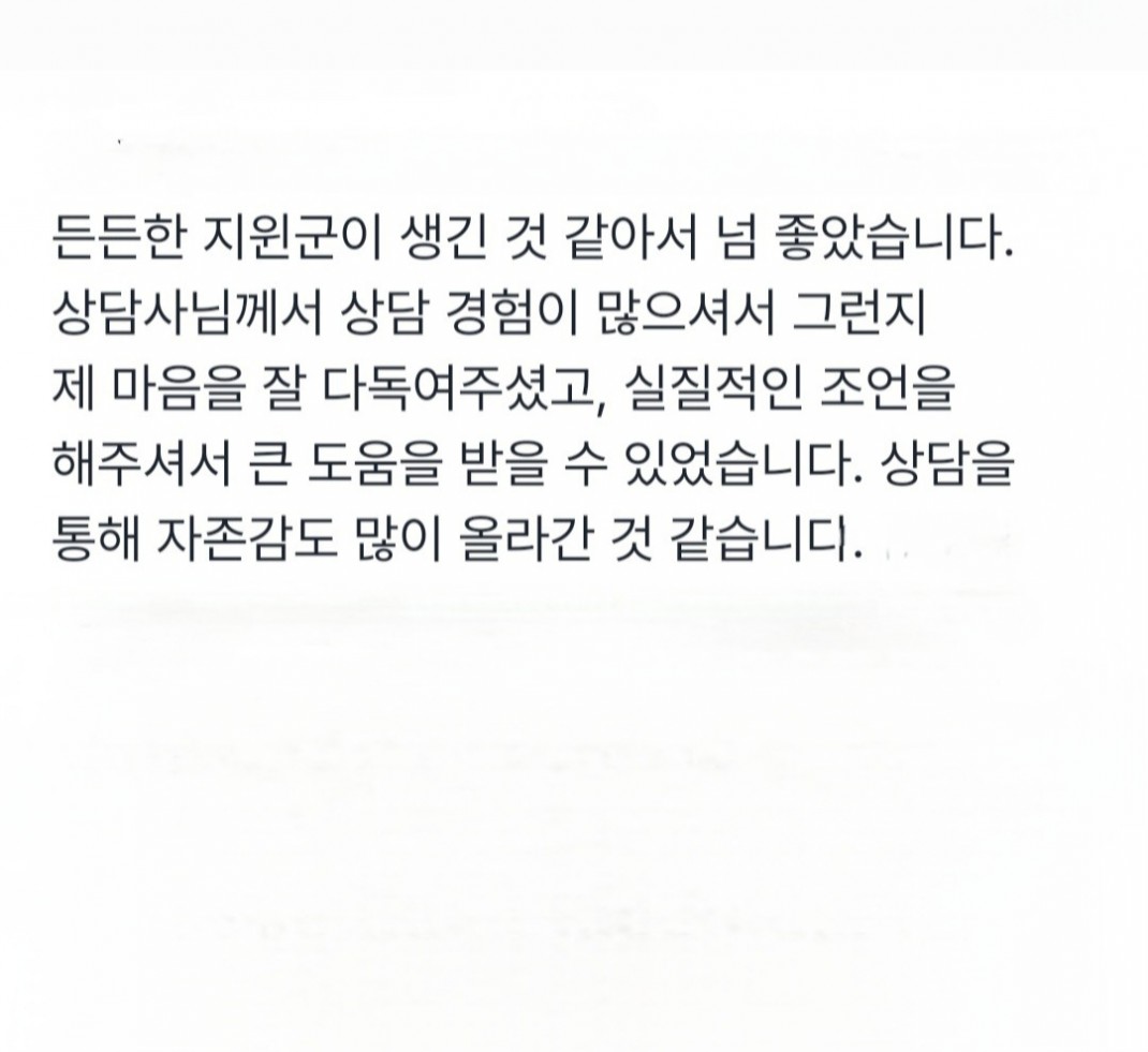 상담을 통해 자존감도 많이 올라간 것 갇습니다. 작성자관리자 등록일 25-08-25 조회26회 본문 상담을 통해 자존감도 많이 올라간 것 갇습니다. 애인과 이별/술문제로 밤에 불안감이 많이 들어 급하게 상담 요청 개인적인 일로 너무 힘든데 멘탈이 안잡아지고 답답해서 당일 예약으로 부탁드 렸는 목록 글쓰기