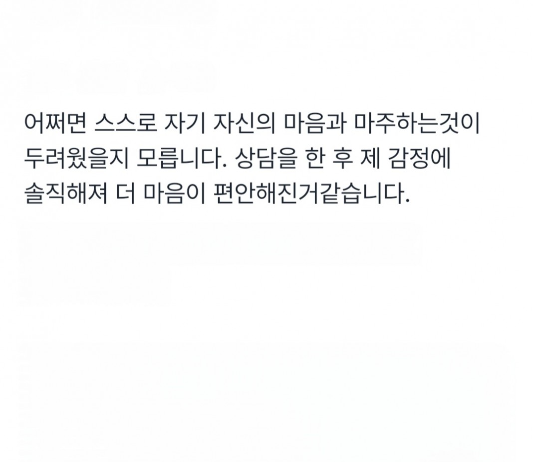 어쩌면 스스로 자기 자신의 마음과 마주하는것이 두려웠을지 모릅니다. 작성자관리자 등록일 25-08-25 조회23회 본문 어쩌면 스스로 자기 자신의 마음과 마주하는것이 두려웠을지 모릅니다. 상담을 한후 제 감정에 솔직해져 더 마음이 편안해진거같습니다. 궁금했던 부분 너무 잘 설명 해주십니다. 애인과 이별/술문제로 밤에 불안감이 많이 들어 급하게 상담 요청 목록 글쓰기
