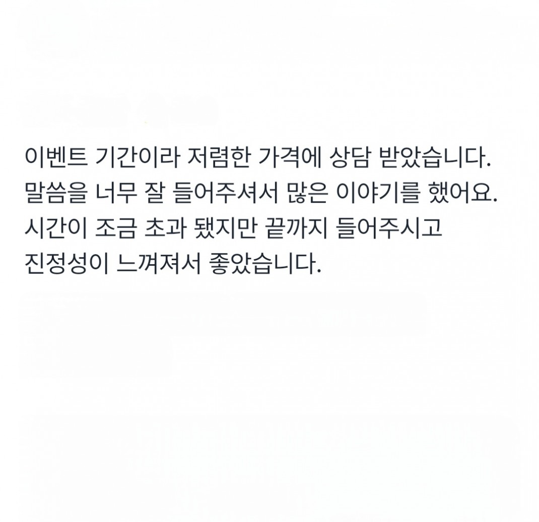 이벤트 기간이라 저렴한 가격에 상담 받았습니다 작성자관리자 등록일 25-08-25 조회26회 본문 이벤트 기간이라 저렴한 가격에 상담 받았습니다. 말씀을 너무 잘 들어주셔서 많은 이야기를 했어요. 시간이 조금 초과 됐지만 끝까지 들어주시고 진정성이 느껴져서 좋았습니다. 차분하게 끝까지 경청해주시고 공감해주셔서 제가 처음 해보는 일, 마음이 불안하고 힘들었을 때 목록 글쓰기