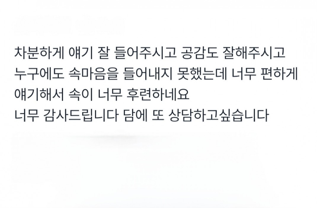 차분하게 얘기 잘 들어주시고 공감도 잘해주시고 작성자관리자 등록일 25-08-25 조회38회 본문 차분하게 얘기 잘 들어주시고 공감도 잘해주시고 누구에도 속마음을 들어내지 못했는데 너무 편하게 얘기해서 속이 너무 후련하네요 얘기만 해도 해소가 되는 기분이었어요 오늘밤9시 정해진시간에 상담을했네요. 목록 글쓰기