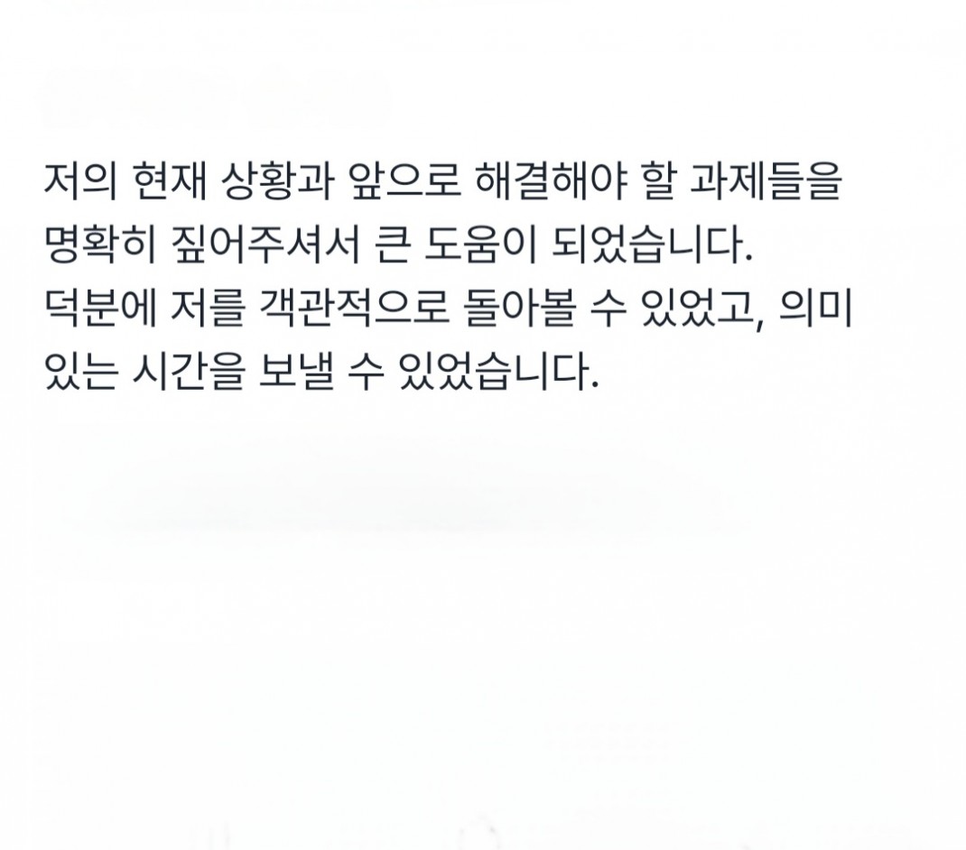 저의 현재 상황과 앞으로 해결해야 할 과제들을 명확히 짚어주셔서 작성자관리자 등록일 25-09-03 조회31회 본문 저의 현재 상황과 앞으로 해결해야 할 과제들을 명확히 짚어주셔서 큰 도움이 되었습니다. 덕분에 저를 객관적으로 돌아볼 수 있었고, 의미 있는 시간을 보낼 수 있었습니다. 불안감이 심해서 몇년을 혼자 끙끙 앓다가 누구에도 속마음을 들어내지 못했는데 목록 글쓰기