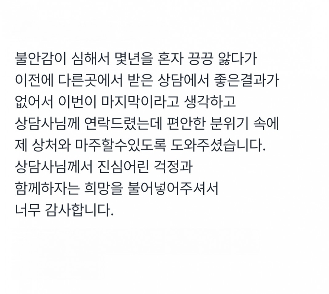 불안감이 심해서 몇년을 혼자 끙끙 앓다가 이전에 다른곳에서 받은 상담에서 좋은결과가 없어서 이번이 마지막이라고 생각하고 상담사님께 연락드렸는데 편안한 분위기 속에 제 상처와 마주할수있도록 도와주셨습니다. 상담사님께서 진심어린 걱정과 함께하자는 희망을 불어넣어주셔서 너무 감사합니다.